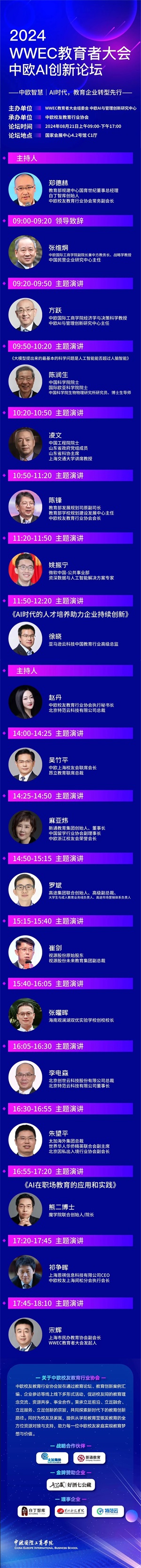 WWEC|中歐AI 創(chuàng)新論壇 主題:中歐智慧|AI 時代,教育企業(yè)轉(zhuǎn)型先行 時間:8月21日(周三) 9:00-17:30 地點:國家會展中心(上海)4.2號館【C1廳】? (上海市崧澤大道333號) 主辦:中歐AI與管理創(chuàng)新研究中心 WWEC教育者大會組委會 聯(lián)合主辦:中歐校友教育行業(yè)協(xié)會 協(xié)辦單位:中歐上海校友會 中歐北京校友會 中歐校友數(shù)字生態(tài)俱樂部 支持單位:新通教育