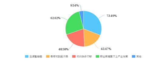 教師卷:您認為高職教育的根本難點在于?1509位受訪教師,73.49%認為是生源素質(zhì)差,其次是職業(yè)教育跟不上產(chǎn)業(yè)發(fā)展。(制圖:魏其濛 張茜)