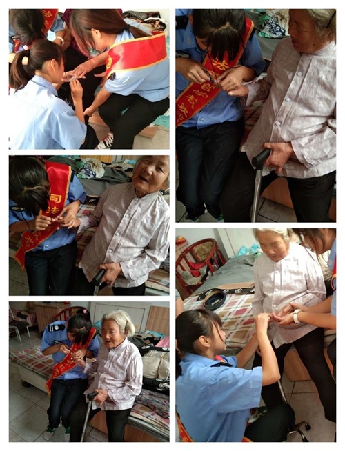 在敬老院中,志愿者們毫不嫌臟。耐心、仔細(xì)地幫助老人們洗腳、洗頭發(fā)、剪指甲。這些都讓同學(xué)們體會(huì)到了老一輩的孤獨(dú)、現(xiàn)在大家的幸福和自私。在那里盡同學(xué)們可能地多和老人聊天、談心,竭盡所能使老人感到溫暖。秦皇島山海關(guān)司法警官職業(yè)培訓(xùn)學(xué)校的學(xué)生們還幫助敬老院的職工一起打掃敬老院。雖然都滿頭大汗,但心里很高興,因?yàn)榇蠹倚睦锒加幸还勺院栏?。而這種自豪感不是在學(xué)校里能夠體會(huì)到的。