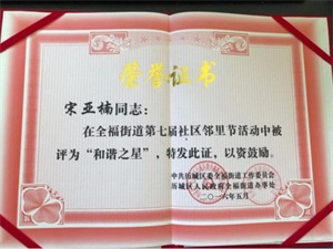 2017年2月被評為社區(qū)優(yōu)秀志愿者。