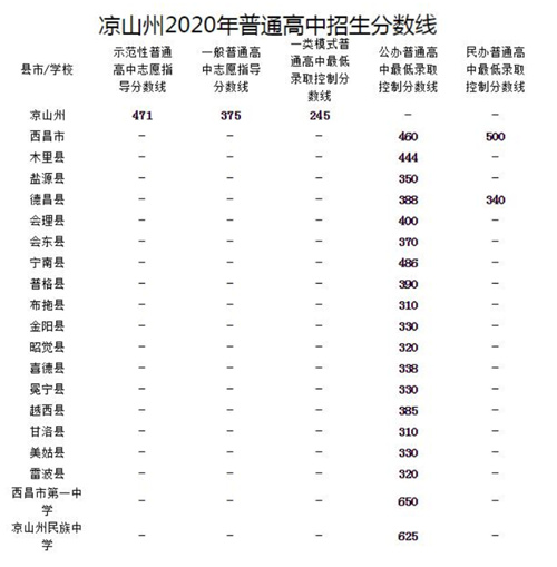 2021年四川涼山中考錄取分?jǐn)?shù)線暫未公布,小編為大家整理了2020年分?jǐn)?shù)線作為參考。2021年分?jǐn)?shù)線將在官方公布后進(jìn)行更新,請大家持續(xù)關(guān)注。 2020年分?jǐn)?shù)
