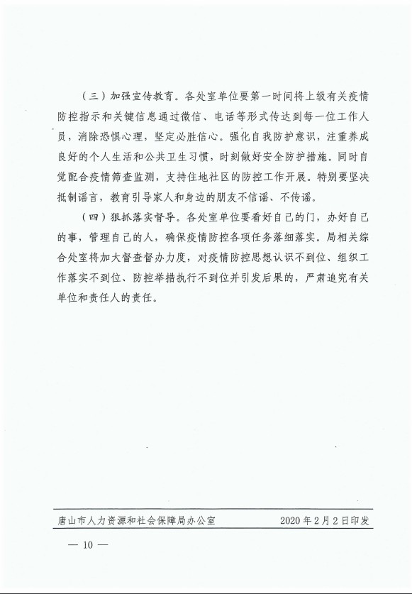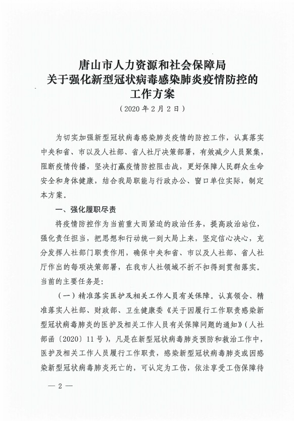 唐山市人社局關于印發(fā)《強化新型冠狀病毒感染的肺炎疫情防控的工作方案》的通知