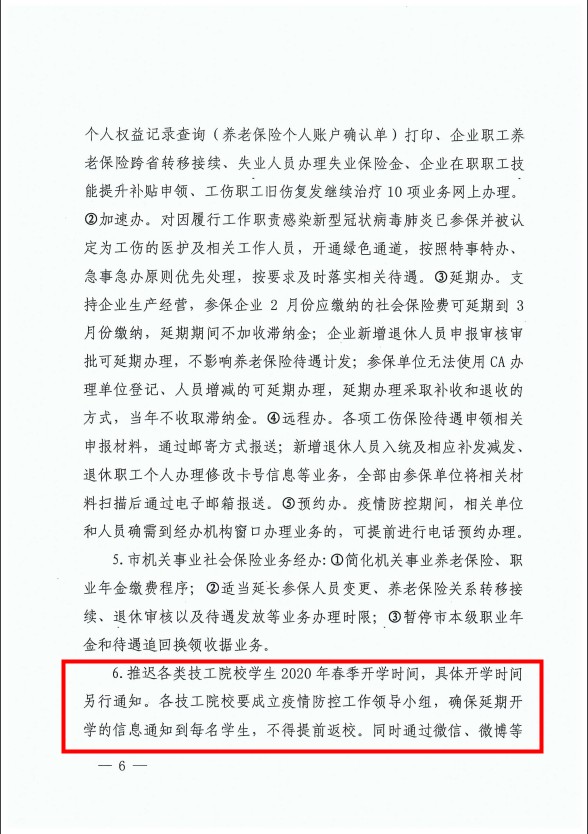 推遲各類技工院校學生2020年春季開學時間,具體開學時間另行通知。各技工院校要成立疫情防控工作領導小組,確保延期開學的信息通知到每名學生,不得提前返校。同時通過微信、微博等各種網絡渠道進行假期生活提示,開展健康教育,做好防護引導。