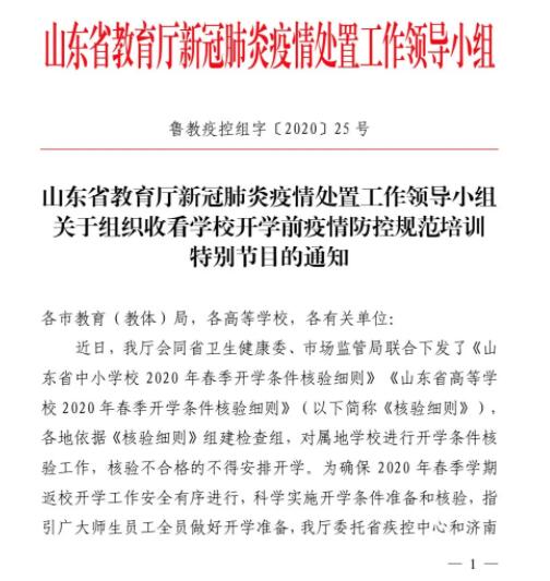 各市教育(教體)局,各高等學(xué)校,各有關(guān)單位:近日,我廳會同省衛(wèi)生健康委、市場監(jiān)管局聯(lián)合下發(fā)了《山東省中小學(xué)校 2020 年春季開學(xué)條件核驗細則》《山東省高等學(xué)校 2020 年春季開學(xué)條件核驗細則》(以下簡稱《核驗細則》),各地依據(jù)《核驗細則》組建檢查組,對屬地學(xué)校進行開學(xué)條件核驗工作,核驗不合格的不得安排開學(xué)。為確保 2020 年春季學(xué)期返校開學(xué)工作安全有序進行,科學(xué)實施開學(xué)條件準(zhǔn)備和核驗,指引廣大師生員工全員做好開學(xué)準(zhǔn)備,我廳委托省疾控中心和濟南市疾控中心專家,指導(dǎo)錄制了開學(xué)前疫情防控規(guī)范培訓(xùn)特別節(jié)目。請各地、各高校組織學(xué)生、教師和家長認(rèn)真收看?,F(xiàn)將相關(guān)安排通知如下: