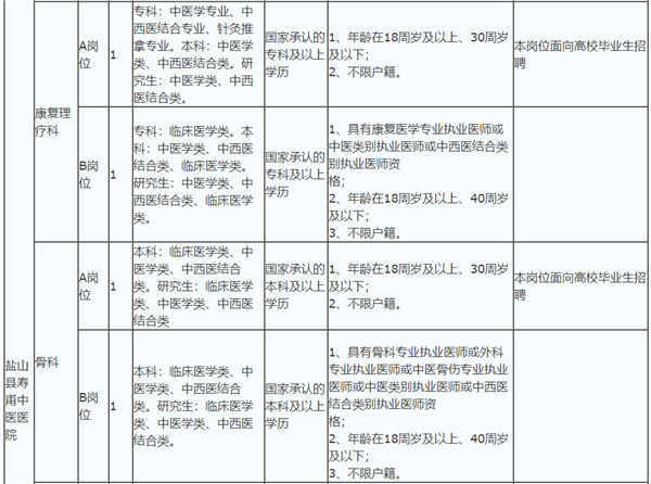 招聘崗位所需的具體條件詳見《2021年鹽山縣壽甫中醫(yī)醫(yī)院公開招聘事業(yè)單位工作人員崗位信息表》(附件1)。留學(xué)回國人員和其他海外、外國學(xué)歷學(xué)位獲得者的專業(yè)名稱與招聘崗位要求專業(yè)名稱不完全一致,但所學(xué)專業(yè)課程與招聘崗位專業(yè)課程大部分相同,且符合該崗位所需要的其他條件的,也可報(bào)考該招聘崗位。